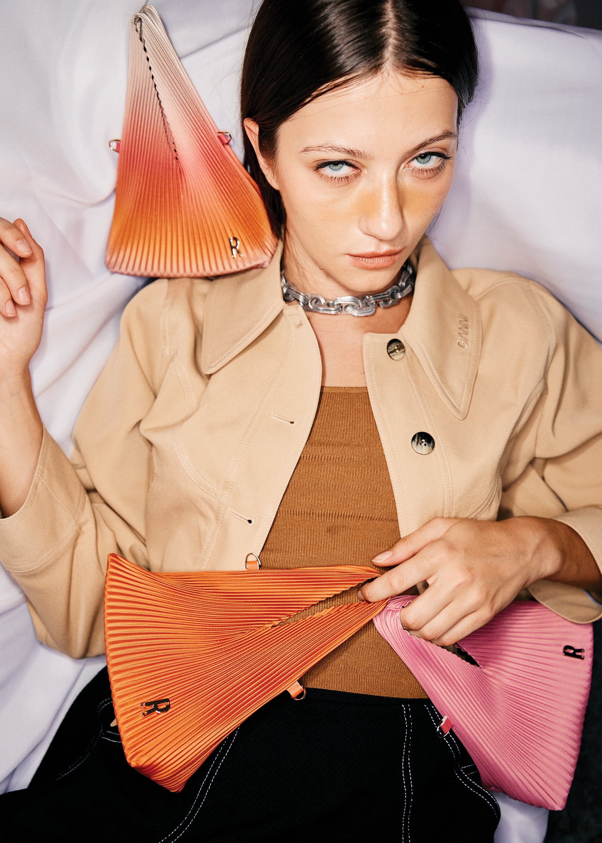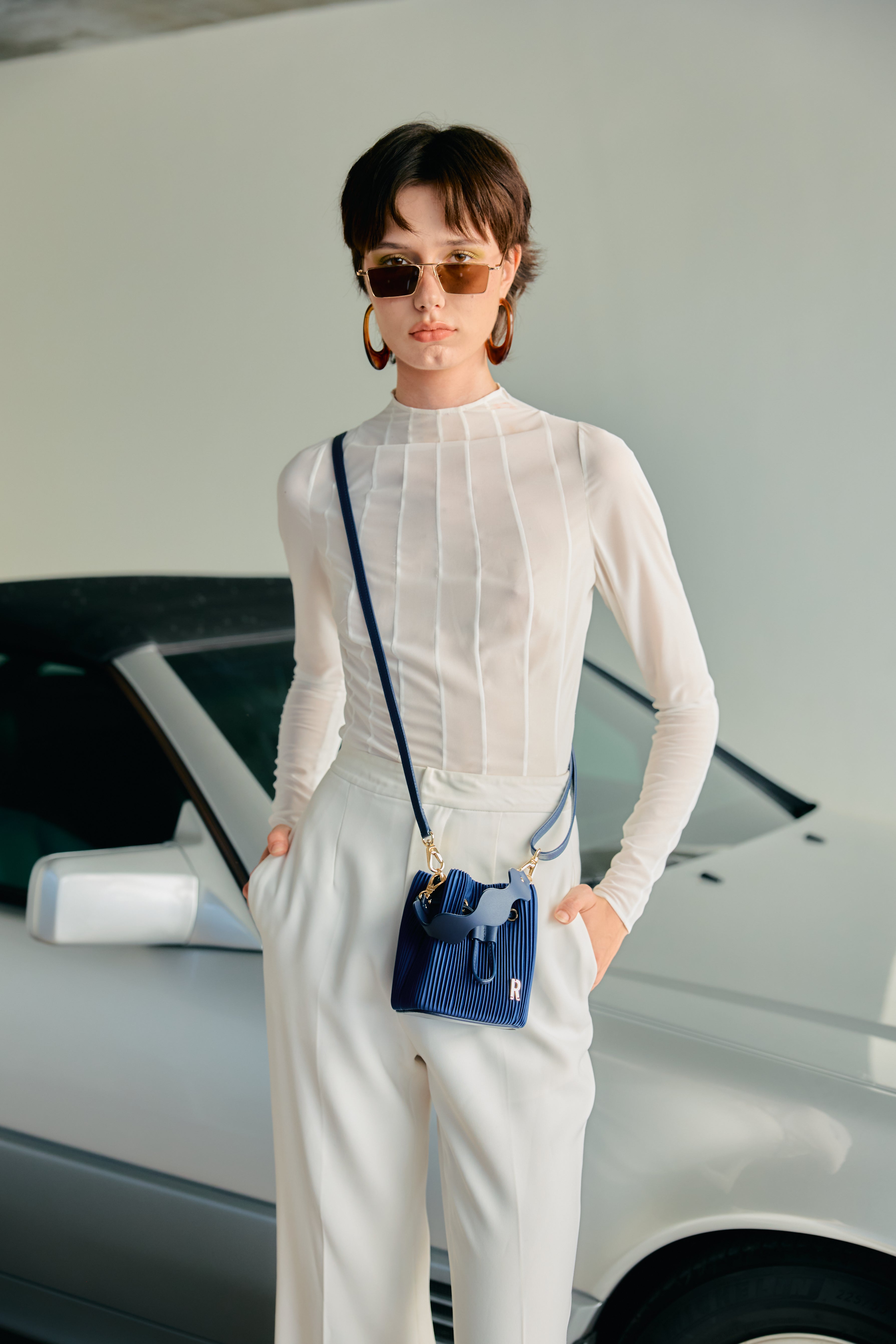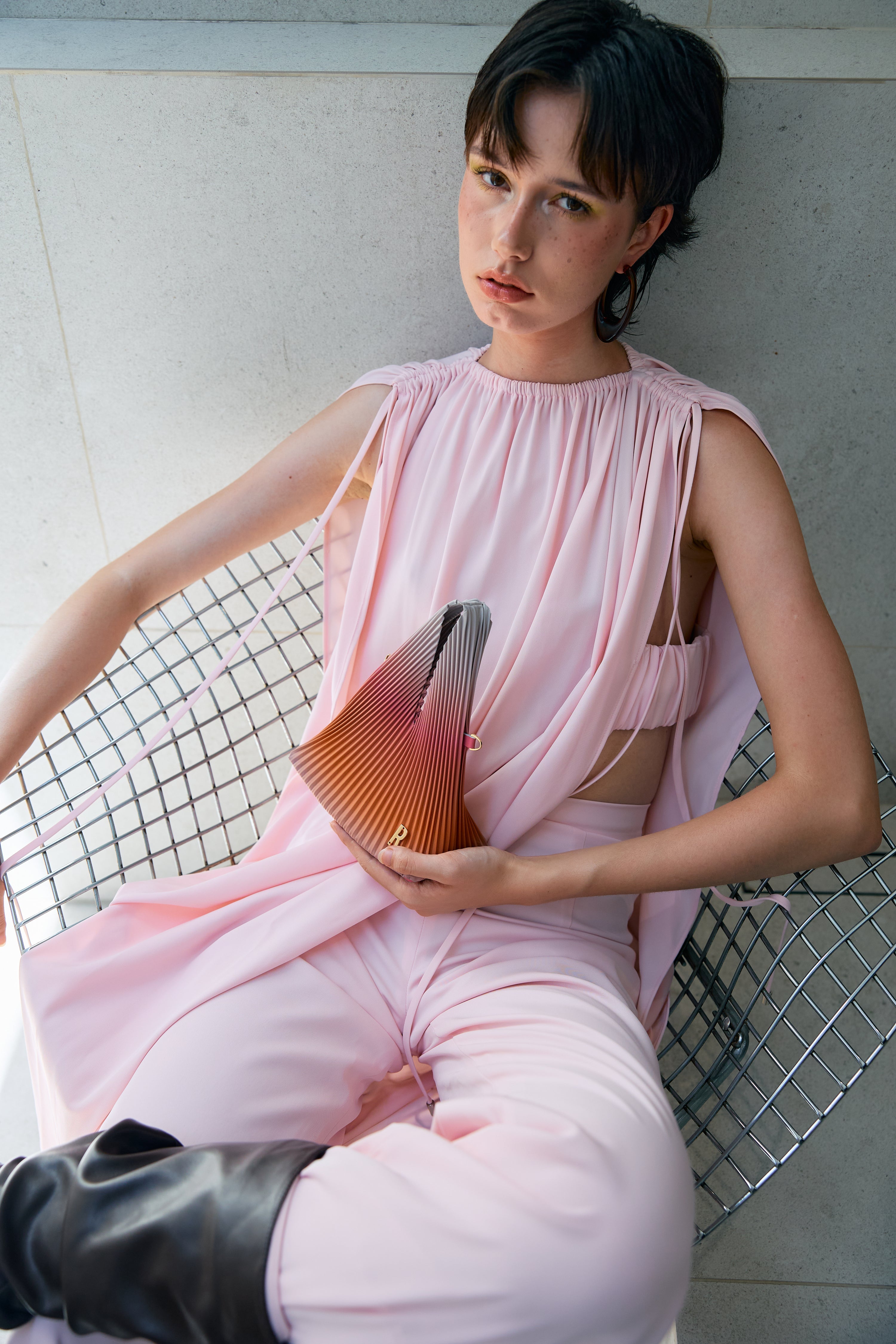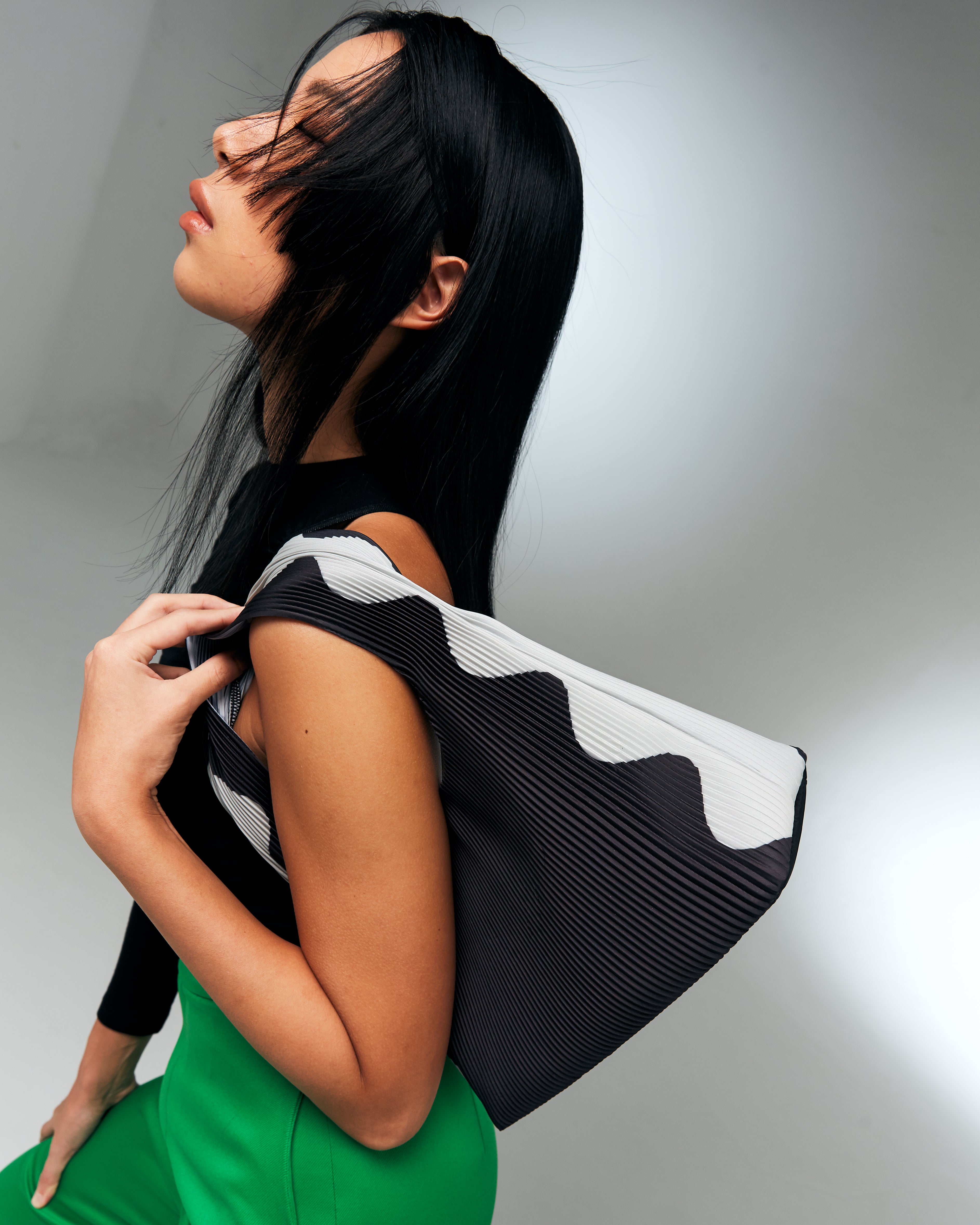 El bolso JUNO combina el plisado característico de REPLEAT con una silueta curva y estructurada.